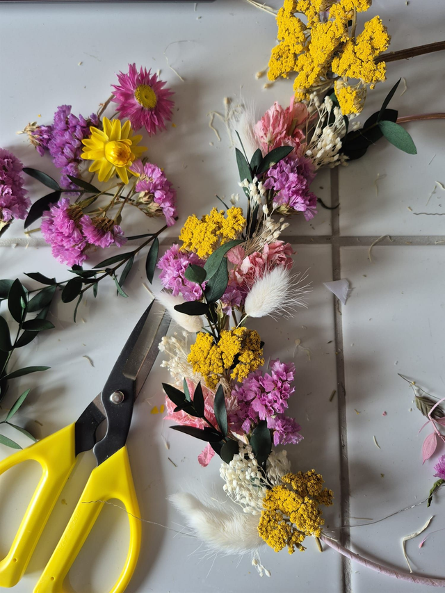 Pendant 2 heures, composez votre demie couronne de fleurs séchées.