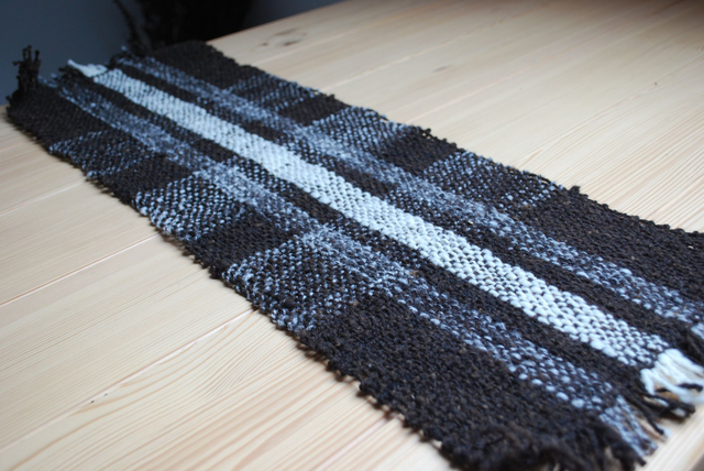 Les fils de ce chemin de table tissé à la main, ont été filés au rouet de manière artisanale à partir de fibres de laine de moutons et brebis de Mayenne (53).
